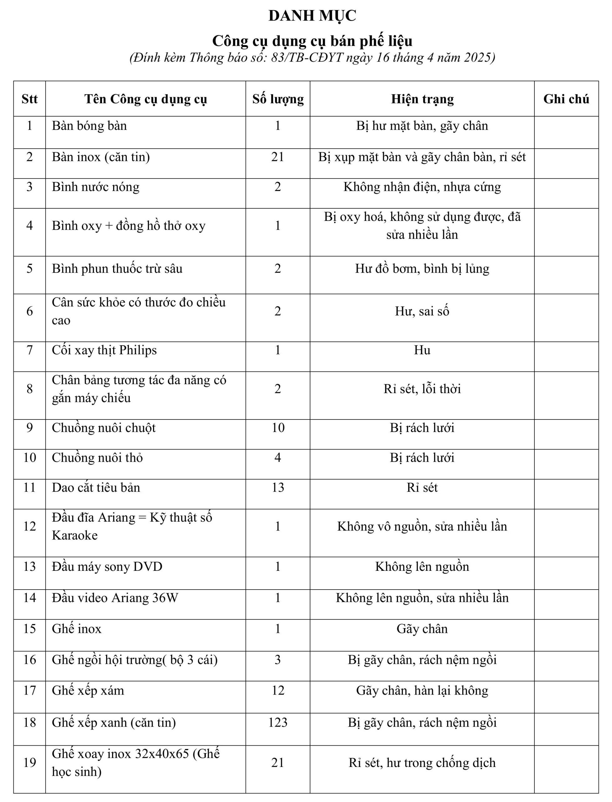 Thông báo bán phế liệu công cụ dụng cụ thanh lý năm 2025