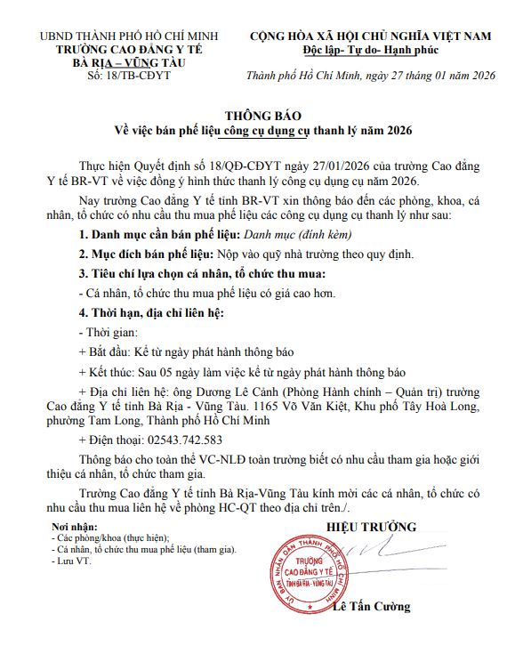 Thông báo bán phế liệu công cụ dụng cụ thanh lý năm 2026 27/01/2026 Đính kèm: thông báo Các tin khác Thông báo mời chào giá gói thầu chăm sóc cây xanh thảm cỏ tại trường Cao đẳng Y tế BR-VT 2026 Thông báo bán phế liệu công cụ dụng cụ thanh lý năm 2025 Thông báo Cung cấp VPP, vật tư văn phòng, dụng cụ vệ sinh năm 2025 Thông báo kết quả trúng thầu gói thầu “Gia công bảng chữ hộp bằng Inox tại trường Cao đẳng Y tế” Thư mời chào giá gia công bảng chữ hộp bằng Inox taị trường Cao đẳng Y tế Thư mời chào giá về việc lựa chọn nhà thầu thực hiện gói thầu Tư vấn thẩm tra báo cáo kinh tế – kỹ thuật công trình bảo dưỡng, sửa chữa tài sản, cơ sở vật chất tại trường Trung cấp Y tế năm 2024 Quyết định về việc phê duyệt kết quả lựa chọn nhà thầu Gói thầu “Mua sắm máy chiếu, màn hình chiếu phục vụ giảng dạy năm 2024” Thông báo giá tài sản cho thuê trực tiếp năm 2024 Thiết kế và in bangron lớp Dân số năm 2024 Thư mời chào giá thuê xe tham gia giảng dạy lớp Dân số năm 2024