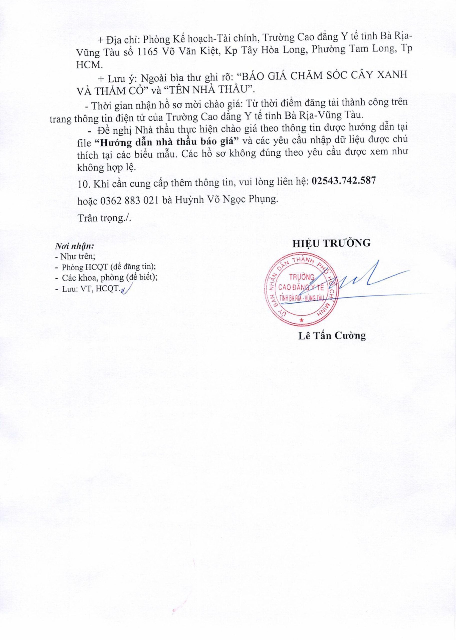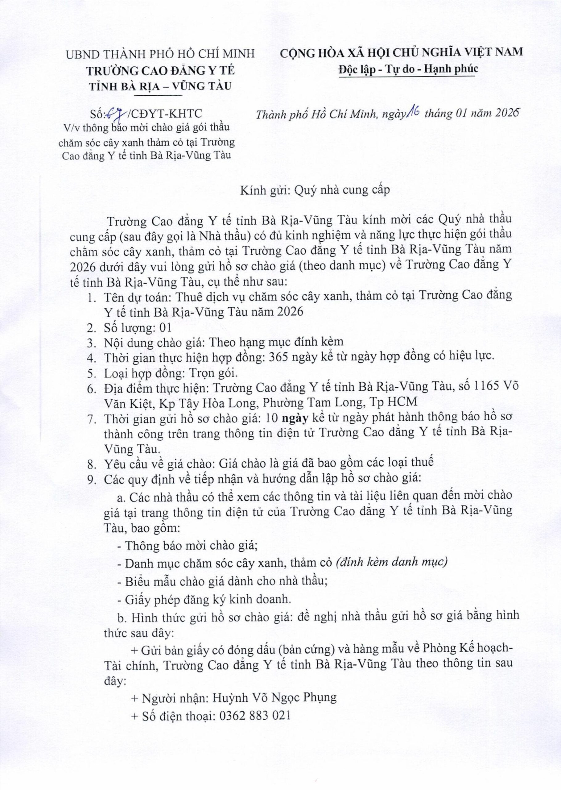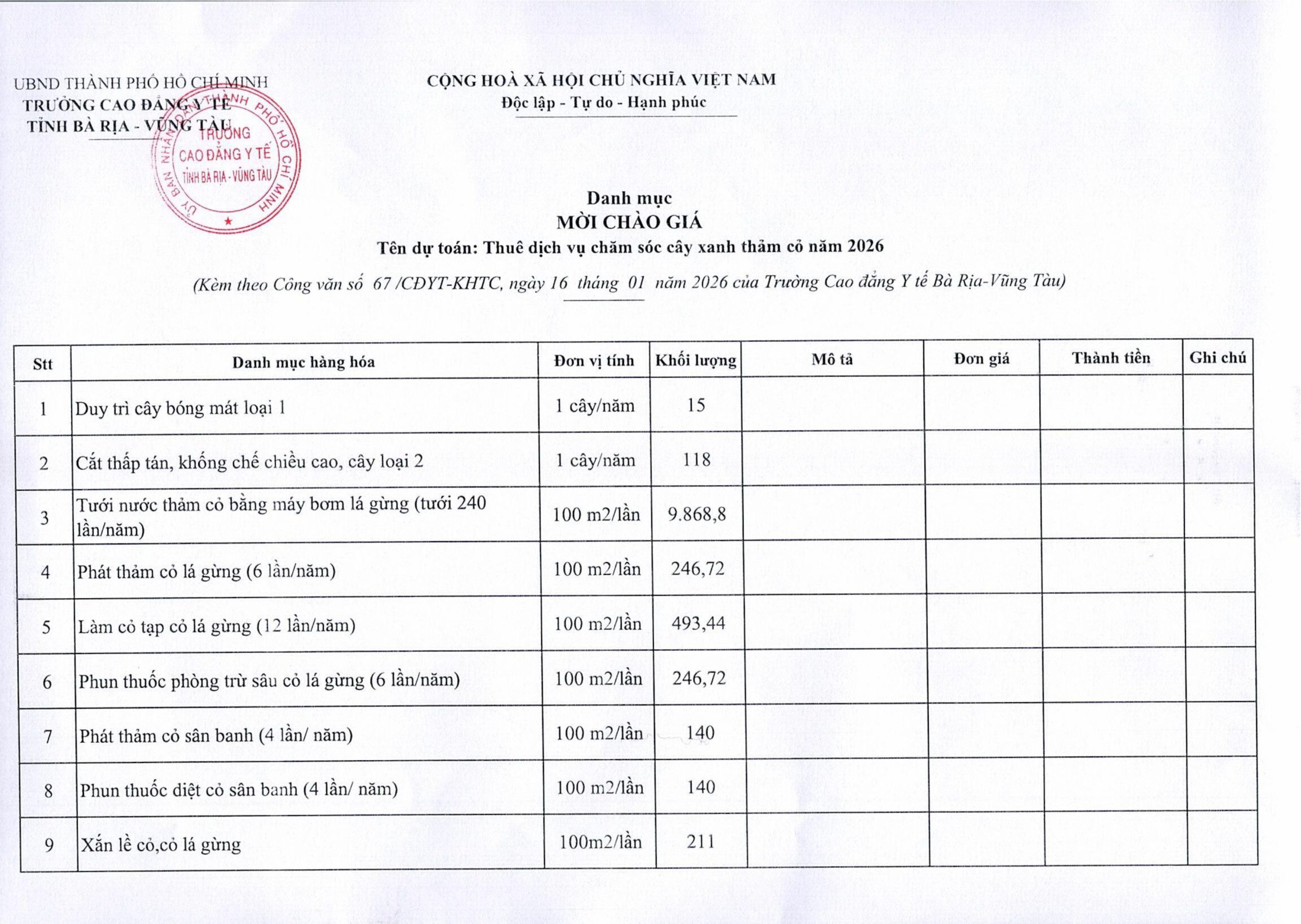 Thông báo mời chào giá gói thầu chăm sóc cây xanh thảm cỏ tại trường Cao đẳng Y tế BR-VT 2026 16/01/2026 Đính kèm: Thông báo chào giá Các tin khác Thông báo mời chào giá gói thầu mua sắm tài sản, trang thiết bị phục vụ công tác giảng dạy đợt 1 năm 2026 tại Trường Cao đẳng Y tế tỉnh Bà Rịa-Vũng Tàu Thông báo kết quả trúng thầu gói thầu “ Tư vấn giám sát thi công xây lắp và thiết bị công trình Bảo dưỡng, sửa chữa cơ sở vật chất và hạ tầng kỹ thuật năm 2025” Thông báo kết quả trúng thầu gói thầu “ Tư vấn quản lý dự án công trình Bảo dưỡng, sửa chữa cơ sở vật chất và hạ tầng kỹ thuật năm 2025” Thông báo kết quả trúng thầu gói thầu “ Tư vấn lập hồ sơ mời thầu, đánh giá hồ sơ dự thầu gói thầu xây lắp và thiết bị thuộc dự án Bảo dưỡng, sửa chữa cơ sở vật chất và hạ tầng kỹ thuật năm 2025 của Trường Cao đẳng Y tế ”